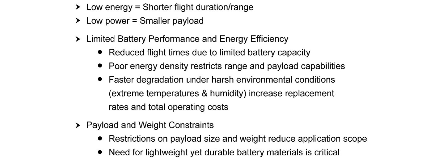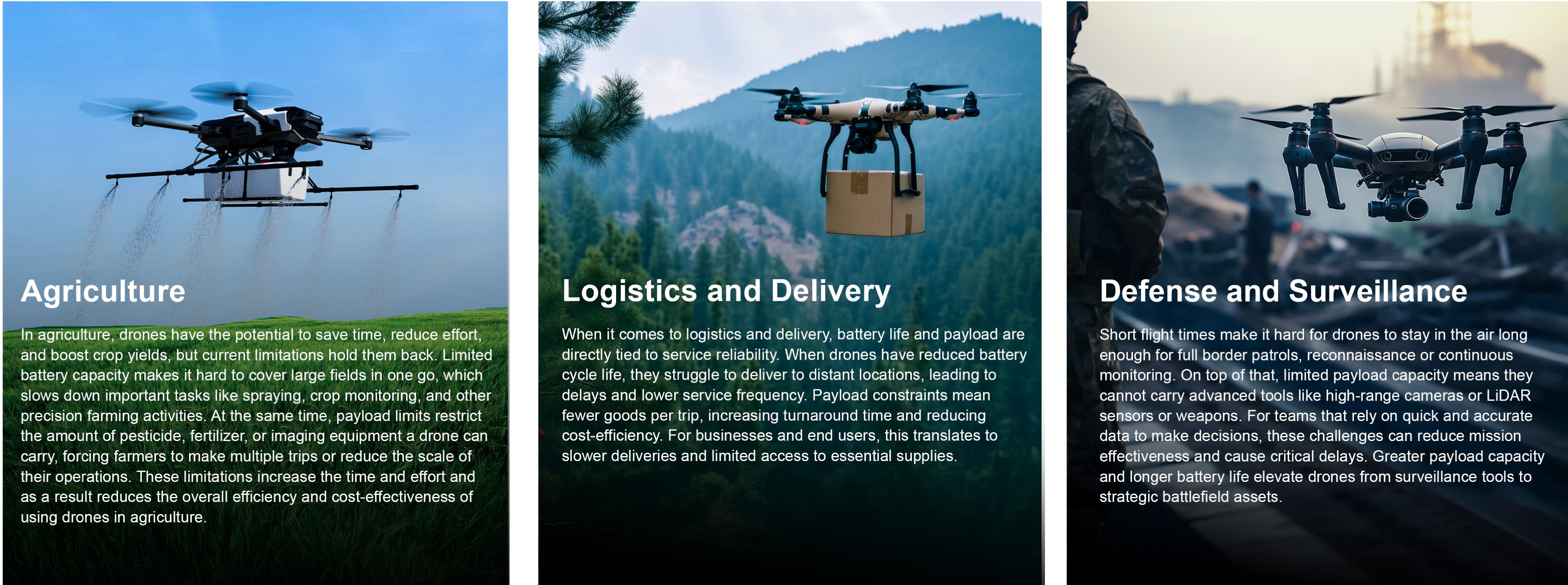 A low energy density or poor energy-to-weight ratio limit how far drones can fly and how much they can carry, both of which are critical in sectors like agriculture, logistics, and surveillance.
