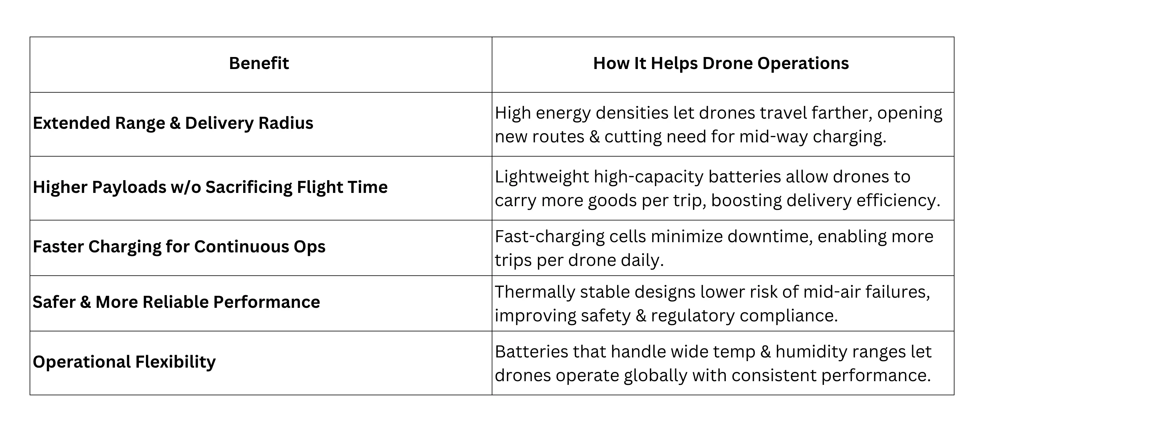 By leveraging these advanced battery technologies, drone logistics companies gain significant advantages: