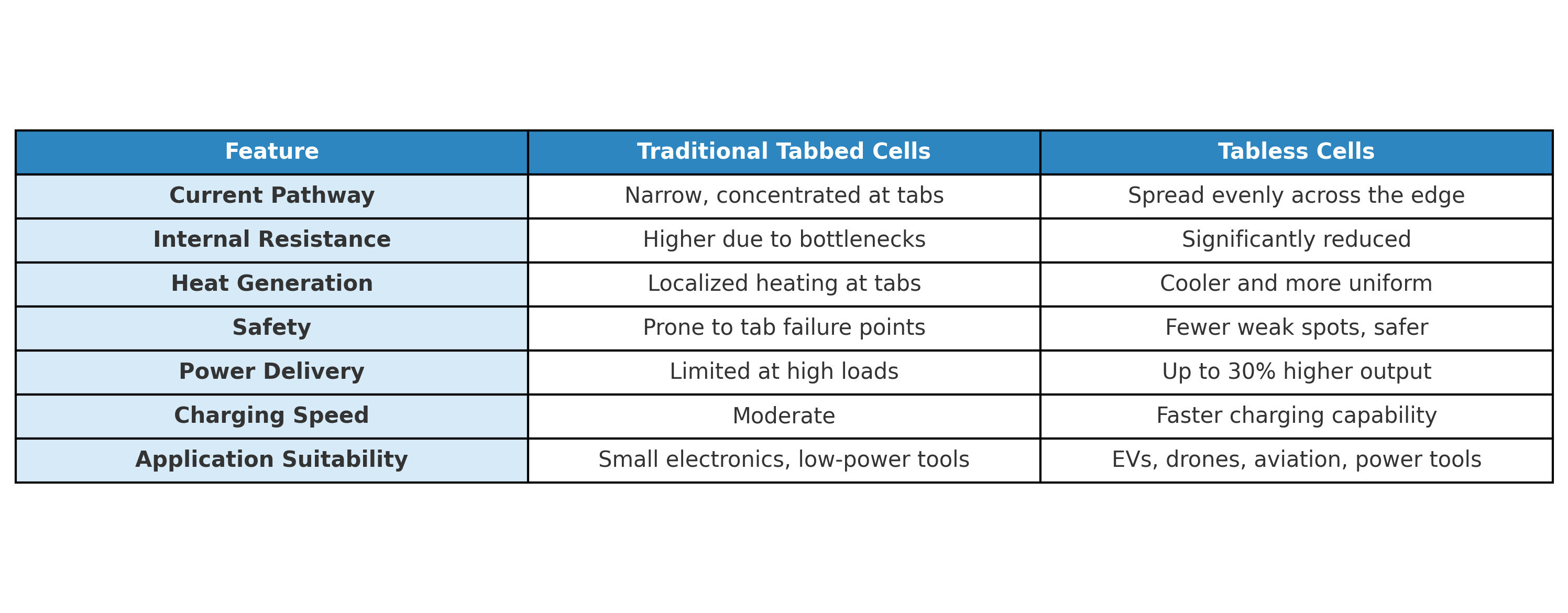 This simple yet revolutionary design shift enables faster charging, longer runtimes, and greater reliability, making tabless cells the go-to choice for the next generation of energy storage.